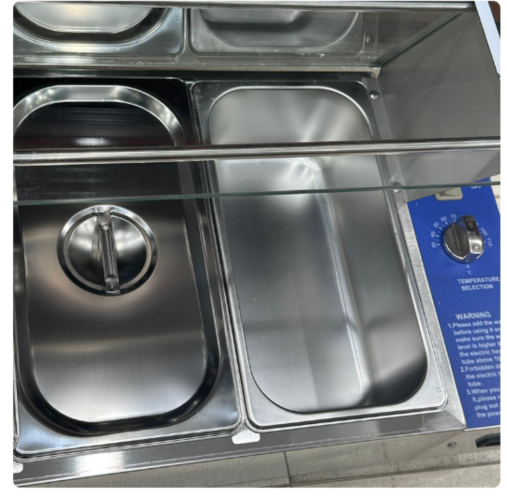 يتميز السخان بتصميمه العملي مع زوايا ملساء، مما يسهل عليك استخدامه وتنظيفه. يتمتع بسطح لامع يعكس الضوء، مما يضيف لمسة جمالية إلى أي بوفيه. كما يحتوي على غطاء زجاجي لحماية الأطعمة من الأتربة والحشرات، مما يضمن لك الحفاظ على نضارة الطعام.